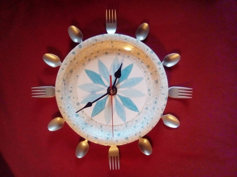 Сделалось за полчаса. Бумажная тарелка, пласт.приборы, часовой механизм. Серединку придумала и делала дочь.
