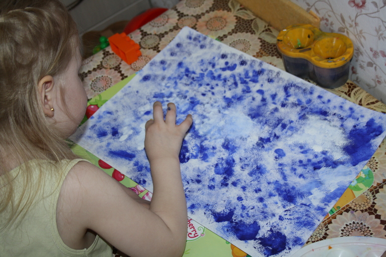 Сначала рисовали небо синей гуашью, а потом белой сделали облака.