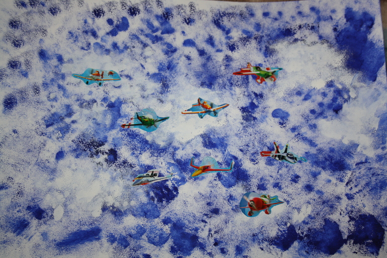 ХУДОЖКА он-лайнСегодня в художке он-лайн мы рисовали небо и самолеты. Валика у нас не было, поэтому рисовали только с помощью поролона.