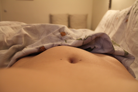 Животик резко стал увеличиваться в размерах...При этом вес стоит на месте (тьфу-тьфу-тьфу, все как обещала гинеколог:)))). Появились новые ощущения - не могу спать на животе - как будто на мячике лежишь, и на спине - тяжело как-то, кишечник что ли придавливает...А еще мой пузеныш сдвинут набок - прикольно так:))) Я даже сфотографировала на память.