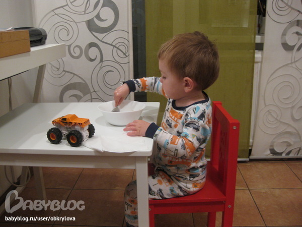 У нас такое бывает так редко, что я запечетляю в восторге каждый такой случай. На фотке федор в пижаме. Недавно появилась привычка- укладываю спать , сосет грудь, насосался, бросает, встает и бежит на кухню с криками " ням-ням", там ест практически все, что предлагаю! И после этого уже идет баю-бай. Вот так - мало ему молочка маминого.