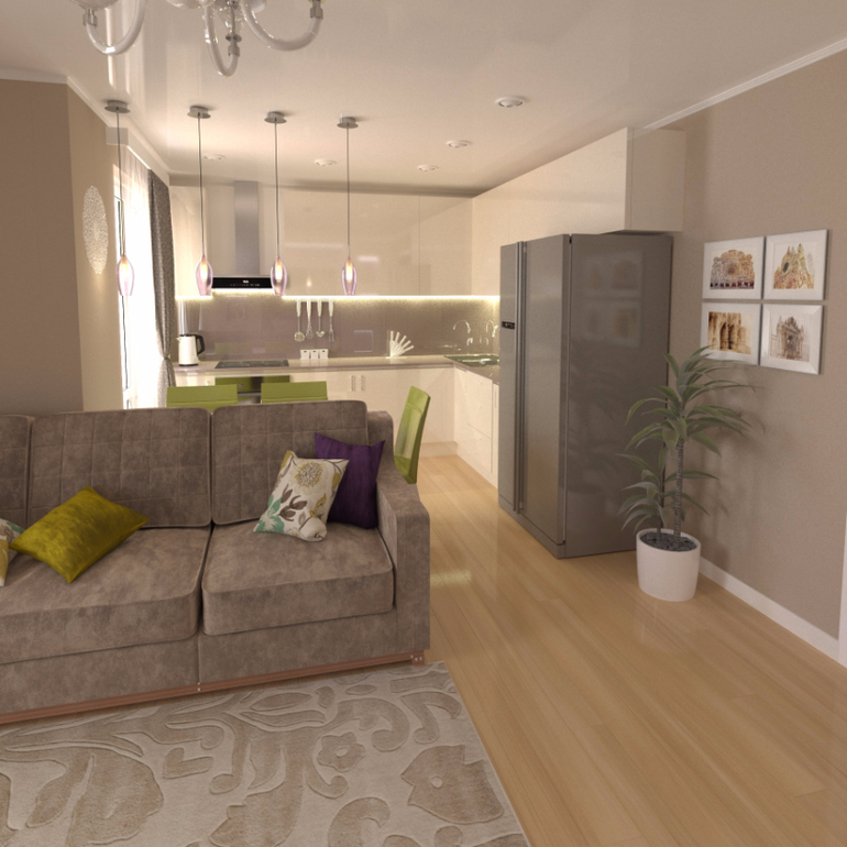 Из задач нужно было вписать большой двухдверный холодильник серебристого оттенка, разместить диван, стол со стульями и желательно барную стойку.