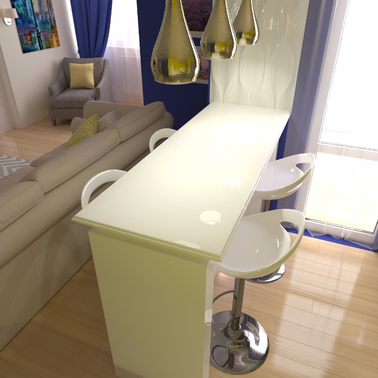 Мы посмотрели как будет выглядеть зона кухни с барной стойкой и 3D панелями, которые очень понравились Марине из моего прошлого проекта