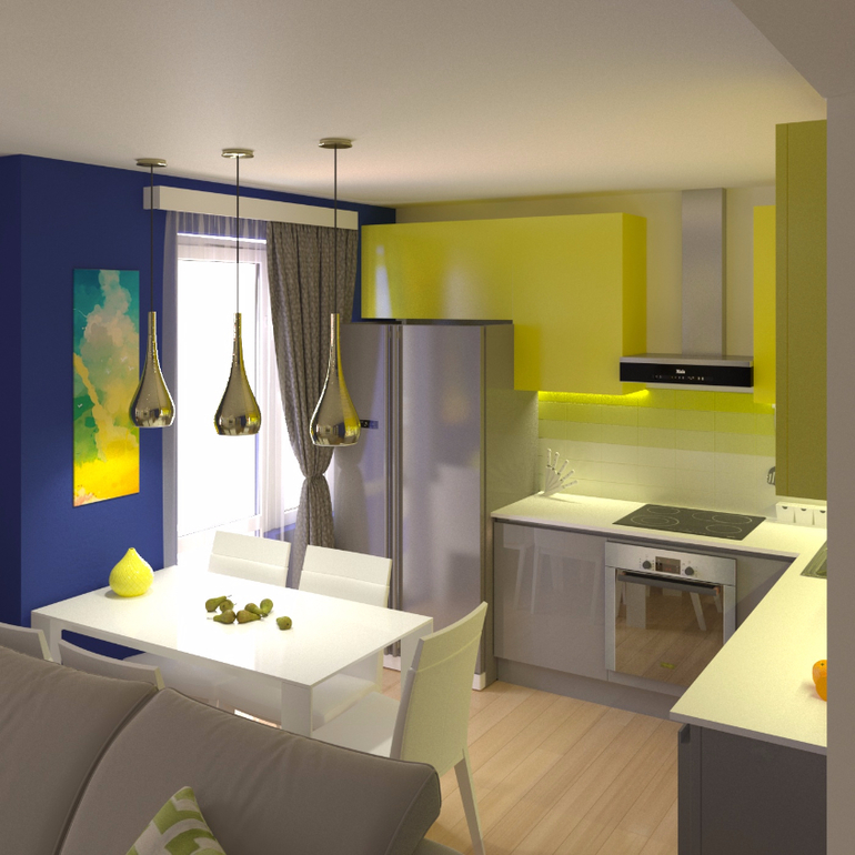 Зона кухни яркая и бодрящая, а зона отдыха слегка помягче. Но изначально мы как-то мало поговорили, и я недопоняла Марину и ее пожелания по цветовой гамме. Но это не страшно, на то она и визуализация, с помощью этого можно примерить такие, необычные варианты и понять что это совсем не ваше.