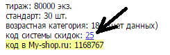 У каждого товара есть код скидки - правый нижний угол на странице товара. Например:
