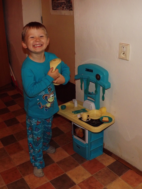 Событие третье. Рабоче-профессиональное. Прилетала к нам в гости на выходные Лешкина мама. привезла Владику какие-то машинки, на которые он даже и не взглянул. бабуля расстроилась. А все из-за чего? Из-за того, что все-таки иногда стоит прислушиваться к моим словам, особенно о том, что Владик не играет с машинками. Поезда, конструктор, строительная техника (бундозегы там, пакгузчики и эскалатогы). Вот наши сегодняшние фавориты. Плюс неожиданное. Так как бабушка была в расстройстве из-за своего неудачного выбора подарка внуку, было принято решение о реабилитации. То есть поход в магазин и покупка нового подарка. Мамы мальчиков, попрошу не кидаться в меня тапками, а, может даже, наоборот, взять на заметку. Купили Владиславу детскую кухню. Счастья полные штаны. Целыми вечерами варит борщ и печет блины. Ну, недетские у моего сына вкусовые приоритеты, что тут попишешь...