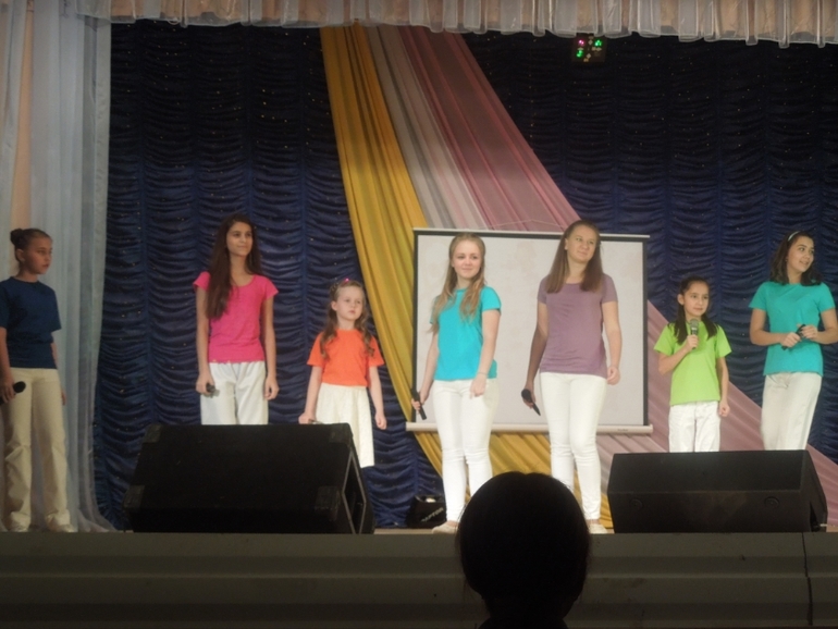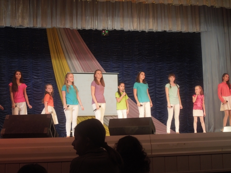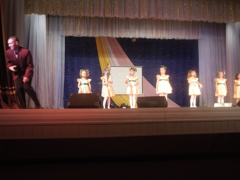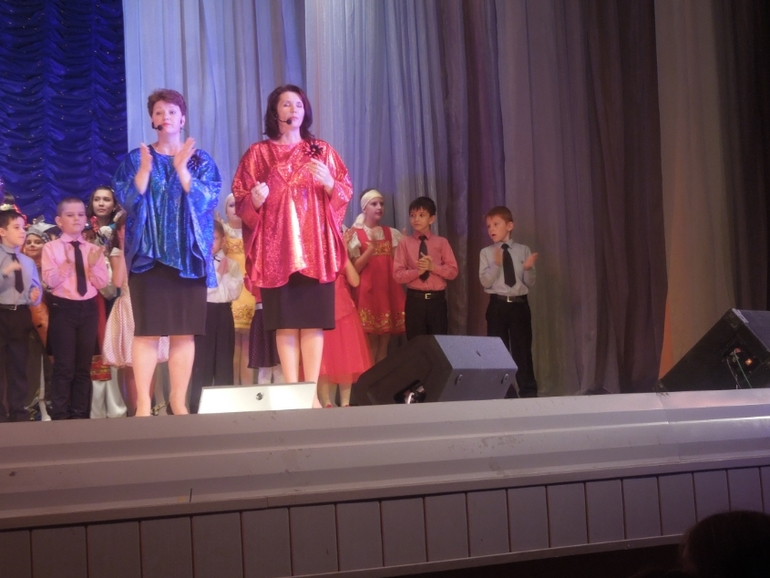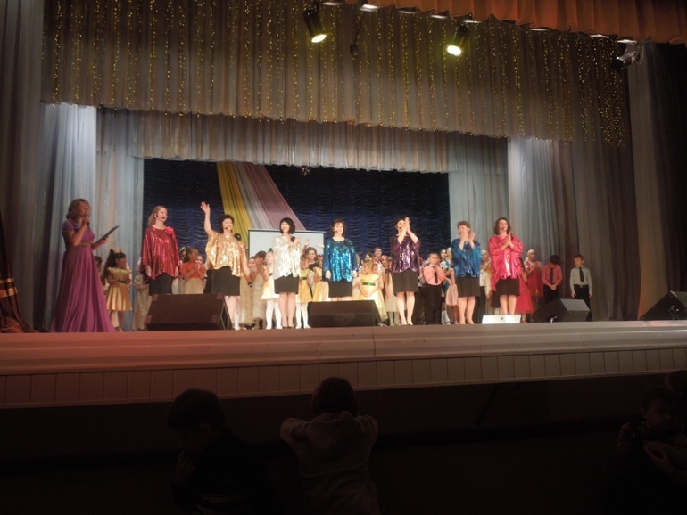 В конце вышел все тот же коллектив в блестящих кофточках..Песню не помню..под конец песни на сцену вышли все детки и взрослые,которые участвовали в концерте..