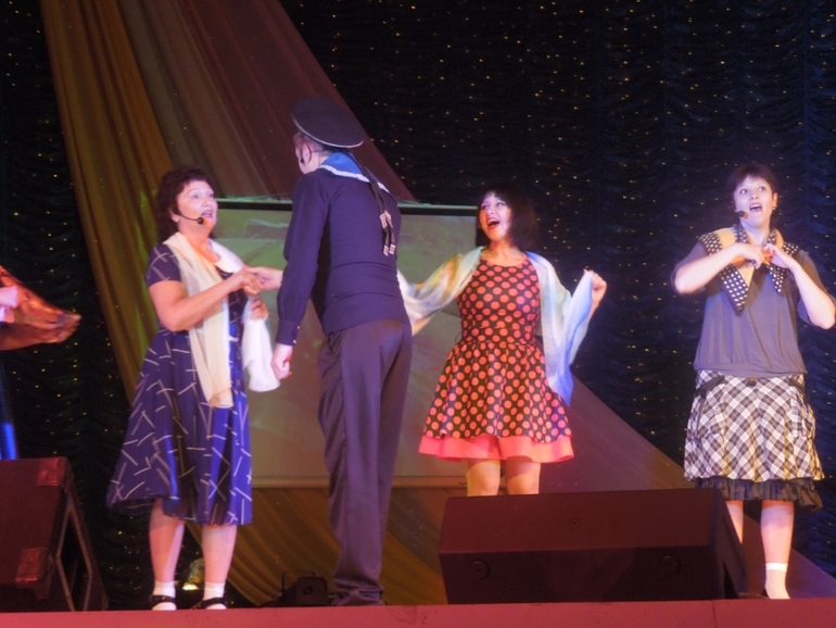 Потом на сцену опять вышли женщины,которые в блестящих кофточках про клен пели..теперь была песня ..На побывку едет молодой моряк.....На середине песни на сцене появился мужчина в одежде моряка)) прям сценка была))