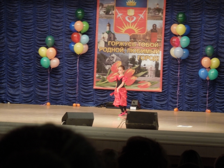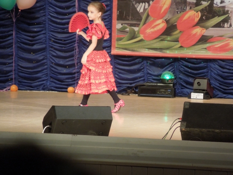 А потом объявили-Выступает солистка коллектива - ****** ****, Глотова Мария. Узнала Фамилию и имя девочки,которая Роме в садике нравилась))в одну группу ходили) Она была в красивом платье красно-черного цвета, танец был связан с Испанией.