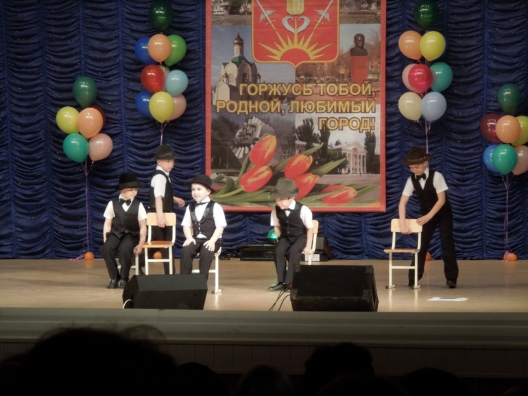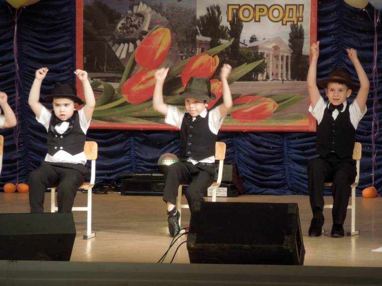 Потом на сцене появились 5 мальчишек в шляпах,со стульями.В белых рубашка.