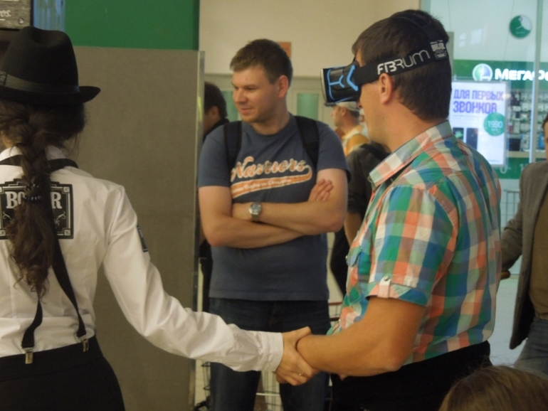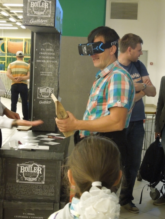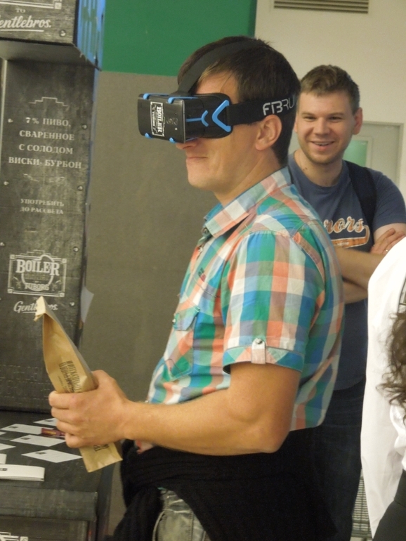В Вавилоне проходила акция-реклама пива..Две симпатичные девушки предлагали погрузиться в атмосферу подпольного бара 20-х годов..одевали огромные очки и там можно было просмотреть ролик...Миша сказал,что было чувство,что он на самом деле находится внутри...Ощущение,что девушка ведет его за руку, с одной стороны за столиками пили люди, с другой сцена, подходил к бару и там ему вручали бутылку пива...