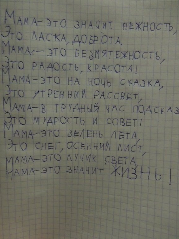 В Театральной студии дали задание: в тетрадке написать своей рукой стихотворение про маму..Нас выручает все то же, которое в саду учили...Вчера сидел писал..вот что получилось