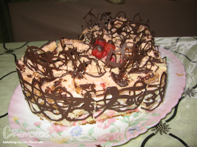 сегодня утром я его сделала. пекла обычный бисквит (с вечера) , крем сметанный+ клубничный сок немного для розового цвета, перкладывала клубникой (была в морозилке). правда 2 проблемки- во-первых переживаю что крем жидковат(не размокнет ли совсем торт?) во-вторых не хватило крема на "обмазать", а времени бежать еще за сметаной не было(( решила попробовать сделать шоколенту кружевную. первый раз. так что косяков куча (оказалось шоколад не особо удобно из кулька из пергаментной бумаги выдавливать). я ленту чуть длинней сделала и остатки повтыкала в торт сверху, потом фото переделаю, тут не видно, он чуть красивей(на этих фото верх наляпан кажется). я же утром дома сфоткала 4 фото, сохранила в черновик, пришла на работу, села писать пост, а тут только 2 фото