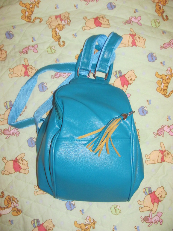Новая сумка, можно носить как рюкзак. Качественный кож.зам. Внутри 1 большое отделение и маленький кармашек, с внешней стороны есть карман - застёгивается на молнию , на собачке кисточка.