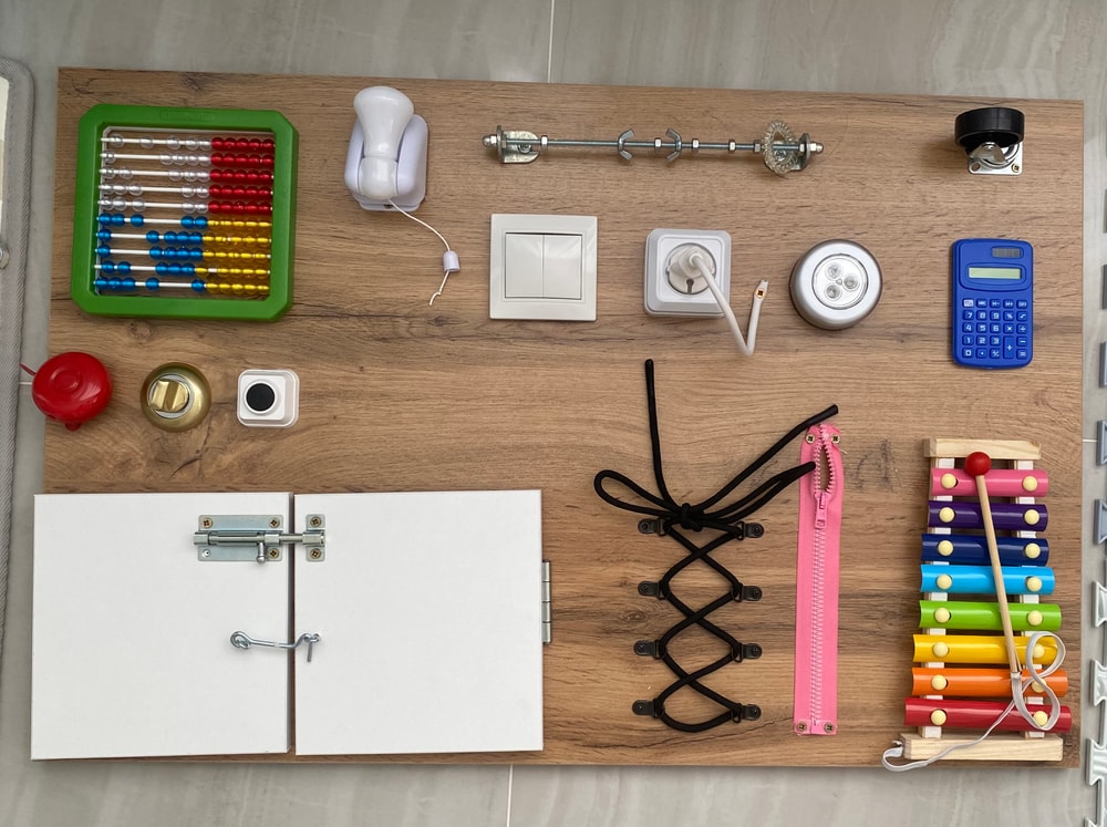Аккуратная, неброская доска с «настоящими» элементами. Без лишней перегрузки, но с интересными штуками для маленьких ручек.