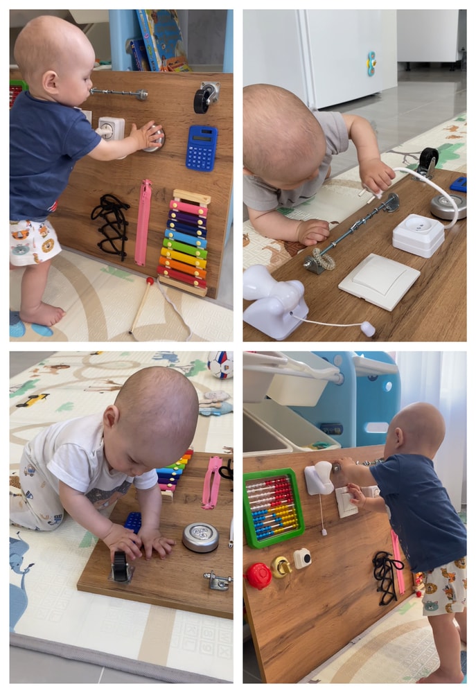 Бизиборд помогает развивать мелкую моторику, внимание, причинно-следственные связи и просто даёт возможность безопасно исследовать предметы из «взрослого мира» 👶