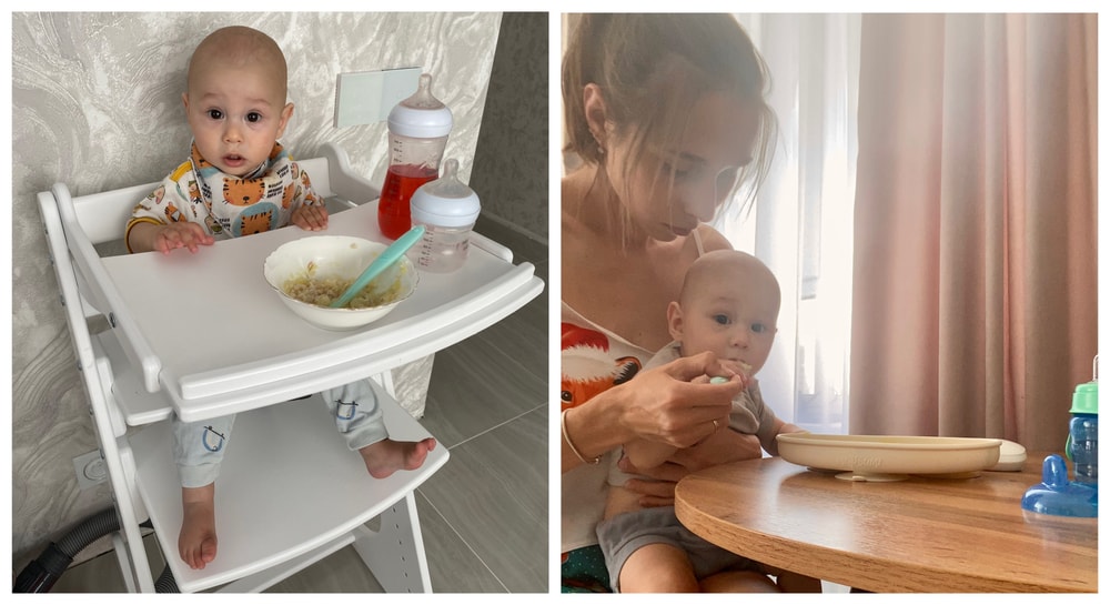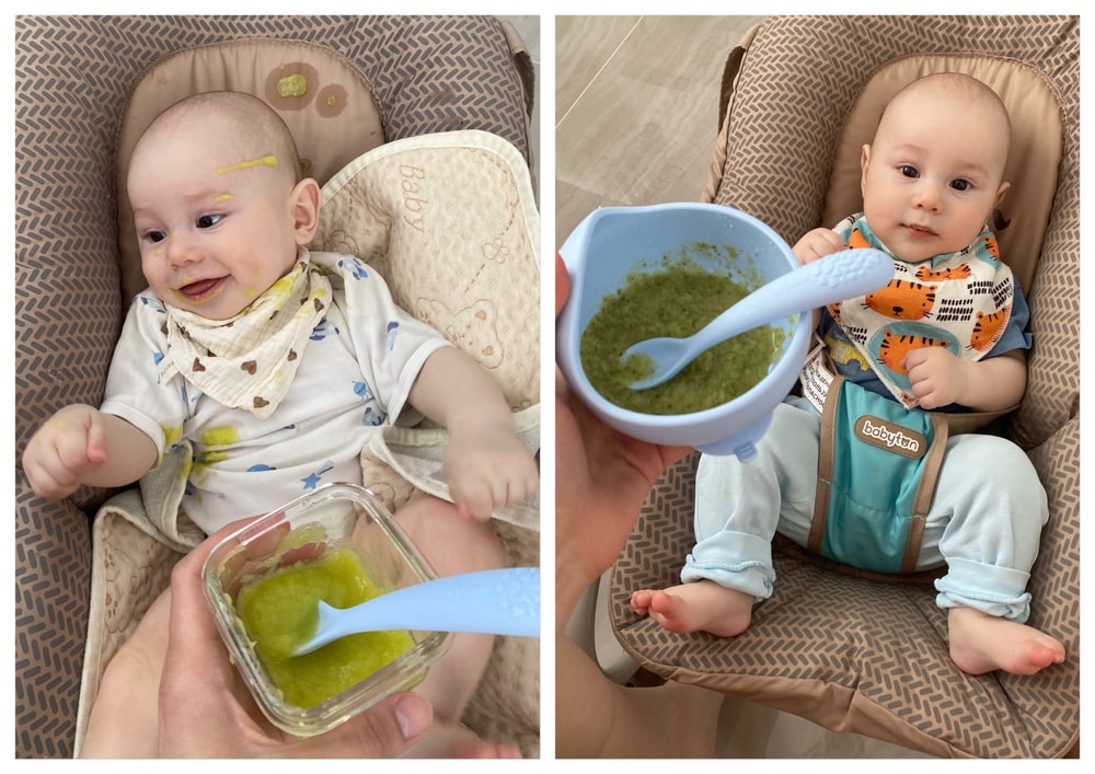 Саша пока не сидит сам уверенно и на стульчике ему не удобно, поэтому кушает у меня на коленях. Я кормлю его сама, но он активно тянет ложку в рот — помогает😄 Я не тороплю его научиться есть самостоятельно — всему своё время.