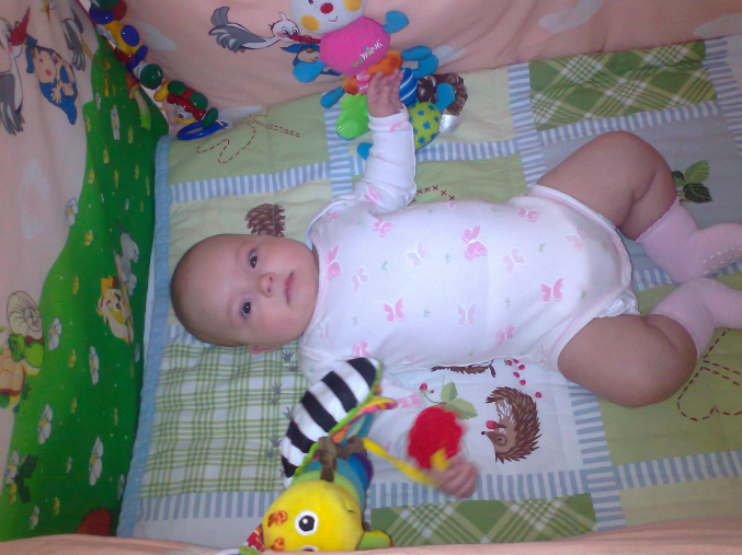 Скоро нам 4 месяца! Кроха моя прям на глазах выросла. Агу наше исчезло, появились гортанные и протяжные звуки. Так смешно получается, словно пытается всех напугать. Научились звать маму, если после предупредительного крика мама не появляется, начинается рев. Но чаще всего время проводим в кроватке с мобилем или на коврике, еще есть шезлонг. Смеется в голос, часто и долго, любит визжать, когда близнецы вокруг скачут. Еще изучаем маму, щупаем нос, глаза, папу потрогали, сморщилась, больно колючий. Из неприятного, мама ввела овощное рагу, кроме супчика и каш, теперь и его ем. Плачем третий вечер, вот думаю, то ли рагу виновато то ли погода. Но отменять пока не буду, пора привыкать, а то через два месяца уже прикорм вводить. Ну и фото...
