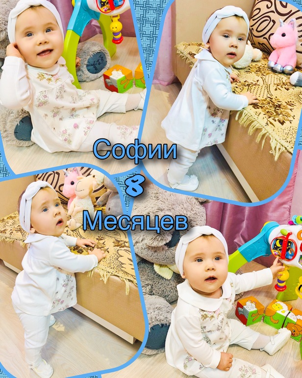 В 7 месяцев и 11 дней София встала у опоры сама. Вот после этого и началась веселая жизнь)))) Ползает с сумасшедшей скоростью😂 Издаёт разные звуки, пытается повторить мяуканье кота)) Готовлю, как и раньше , сама. Утром каша, обед - овощной микс пюре с мяском, полдник - творожок + печенье. Дальше смесь. Отбой в 21:30-22:00 , встаём в 07:30-09:00. Опять же всё относительно. Плюс-минус. Ребёнок идеальный 🙏 Пока у нас только два зуба. Но мы их уже чистим😂💪😍