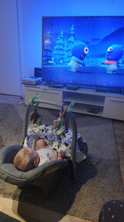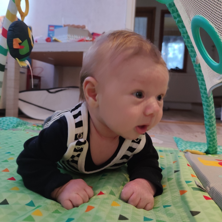 Вот и исполнилось нам два месяца. Сильно изменился за это время. Гуляем много и каждый день бывает даже по 5 часов не смотря ни на что.Полюбил коврик с игрушками ,до этого было не уложить и иногда сидит в автолюлька телик смотрит. Качель которую он так любил ушла в отставку. Любит так же на животе лежать. Ночью спать стали как то по хуже ,кряхтит весь,то ли не попукать то ли что. Но спим 22 до 8-10. Бодурствует по часу иногда чуть больше потом хочет спать. Любит ездить в машине и коляске. Ждём три месяца что бы попробывать ходить в бассейн. Со старшим я уже в три месяца на финский залив его летом водила,он любил воду