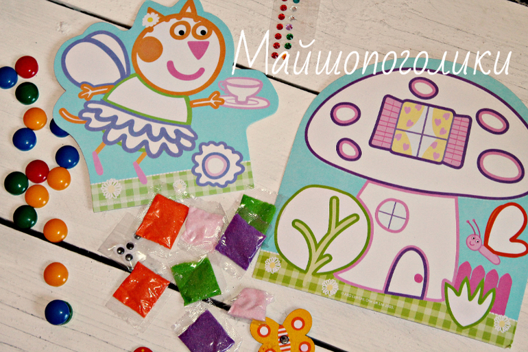 В наборе: 5 фигурных картинок для аппликации, цветной песок, фольга, самоклеящиеся детали ЭВА, стразы, подставки для картинок.