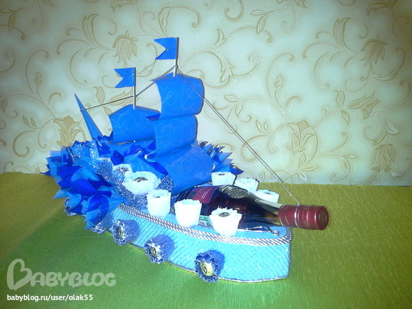 Изучение конфетно-букетной темы мне захотелось начать с кораблика. Прям сразу. Как оказалось, трудное это дело!!! Кораблик был первым, а закончила я его вторым (после пожарной машины на выставку в школу для сына). Недочетов море!!!!!!!!!!! Но что делать, ведь я только учусь. Думая податить его мужу на ближайши праздник.