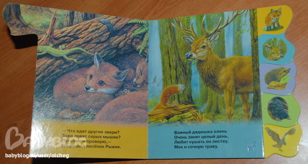 3. Приключения лисенка - милая картонка, которая, кажется, уже почти нигде не продается. Там в серии есть еще про мышонка и оленёнка. Очень простые стихи, милые (местами странные) рисунки... Марк от этой книги в восторге - читаем много и часто!) Особенно развеселило, когда сынуль, глядя на картинку слева, показываел лисят и лису и говорил: "Я, Арина ("А-и") и Мама"... Потом посмотрел на правую картинку и, ткнув в оленя, сказал: "Папа!")))