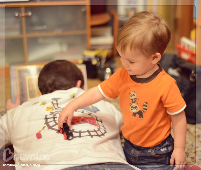 ))) Оль, у нас похожая история, только папе приходится лежать на спине, пока Костян разглядывает горы, нарисованные на одной из футболок, либо играет молнией на ветровке.. но тут, конечно, всё намного креативней!