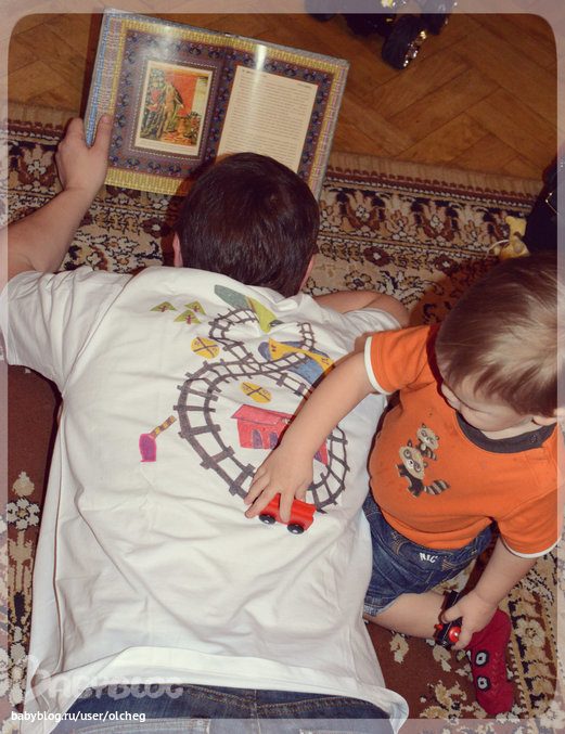 А все благодаря футболке, которую нам недавно подарили! Идея проста: берем белую футболку, фломастеры для ткани и... рисуем то, что близко сердцу Вашего малыша. У нас это железная дорога и "ту-тууу!!!". Затем папа в футболке может читать или спать, а малыш, получив необходимый инвентарь "массирует" папе спинку поездами или машинами, например... Все довольны, все при деле, мама может вздохнуть спокойно и отдохнуть помыть посуду....))