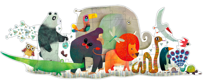 Там 36 больших пазло-кусочков. Марк может собрать картинку сам (понятно, что не важно количество деталей, главное - сложность картинки), несмотря на то, что возраст указан 3+. Сын этот пазл обожает, иногда по два раза в день может его собирать. Часто, мы совмещаем собирание пазла и игру - благо, игр про животных можно придумать сколько угодно много.