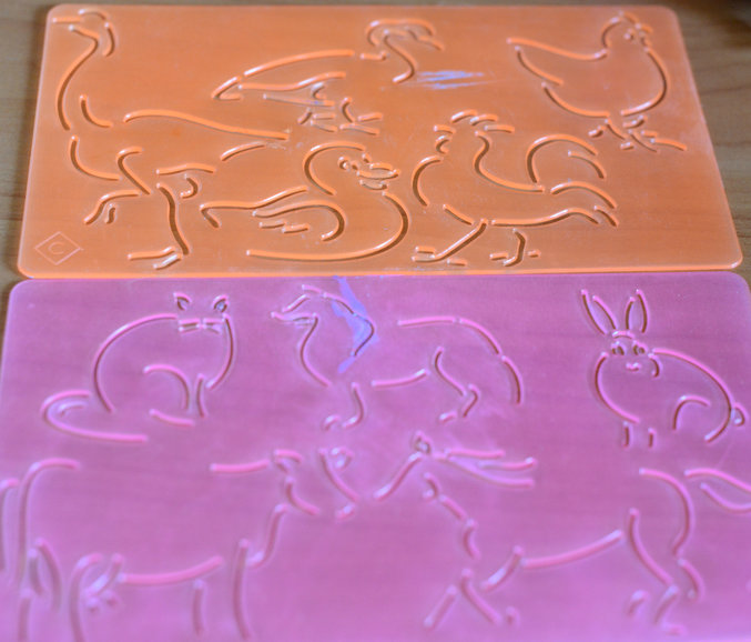 Я не могу сказать, что в п.4 у нас развивающая игрушка, но косвенно - это она) Речь идет о трафаретах. Дело в том, что я не уверена в нужности трафаретов, хотя Марк их любит, внутри фигурку закрашивает и потом пытается пририсовать доп.детали: глазки, носики, еду для зверя и т.п. Хотя для меня трафарет - это, скорее, рамка для ограничения фантазии (вот и придумываю игры, рамку эту ломающие). Короче, помимо обычных трафаретов, у нас есть вот такие:
