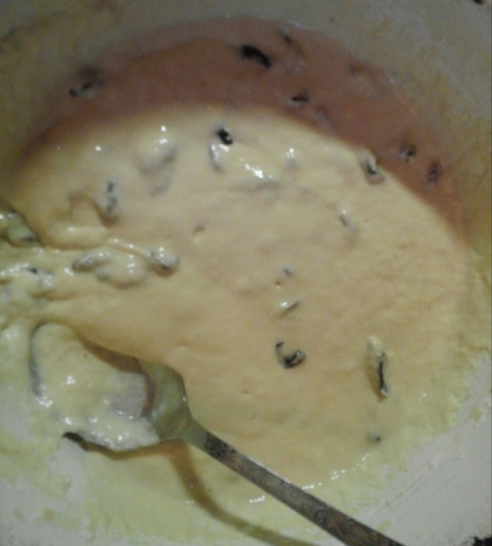 Вмешала венчиком изюм в тесто, вот так должно получиться. Накрыла тазик и оставила тесто на 15 минут, чтобы сода разошлась и клейковина муки разбухла.