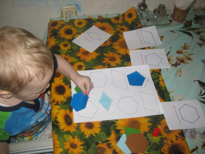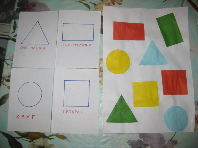 1) Разложила карточки с геометрическими фигурами. Назвала их. Дала вырезанные фигуры из цветной бумаги, а Даня клал нужную фигуру на соответствующую карточку;