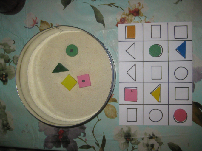 4) Когда сетка была заполнена, просила, "Дай мне круг, квадрат"... и т.д. Это задание выполнял Даня впервые. И на мое удивление (и счастье, потому что думала, что не справится) давал фигурки правильно;