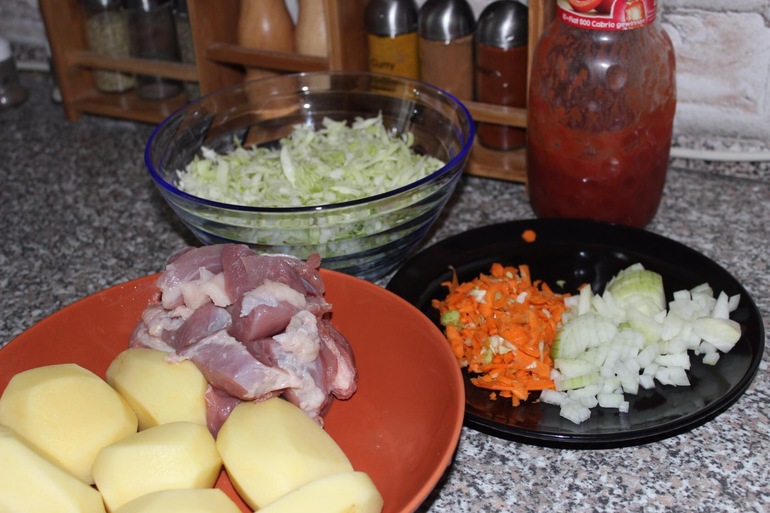 Нам понадобится: любое мясо где то 200г, 7-10 средних картофельн, 1 морковь, 1 лук, 200 г белокочанной капусты, 4 ст Л томатного сока или 2чл томатной пасты.
