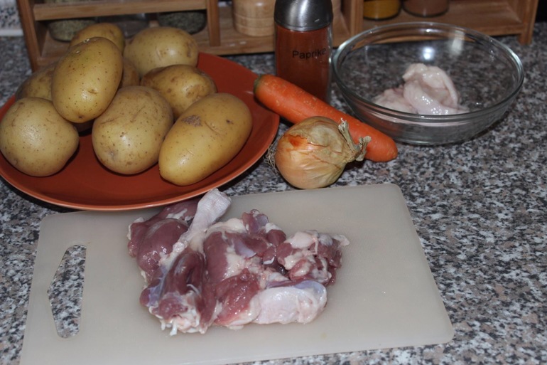 Обычно ляжки утки я готовлю не разрезая, кладу их прям цельными (но здесь нарезала, что бы детям удобнее было есть), а для праздничного блюда, оставляю их целиком, утка в мультиварке получается очень сочная и мягкая. Нам понадобится: картофель, утиное мясо, одна морковь, одна луковица, я ещё добавляла сухую паприку, соль по вкусу.