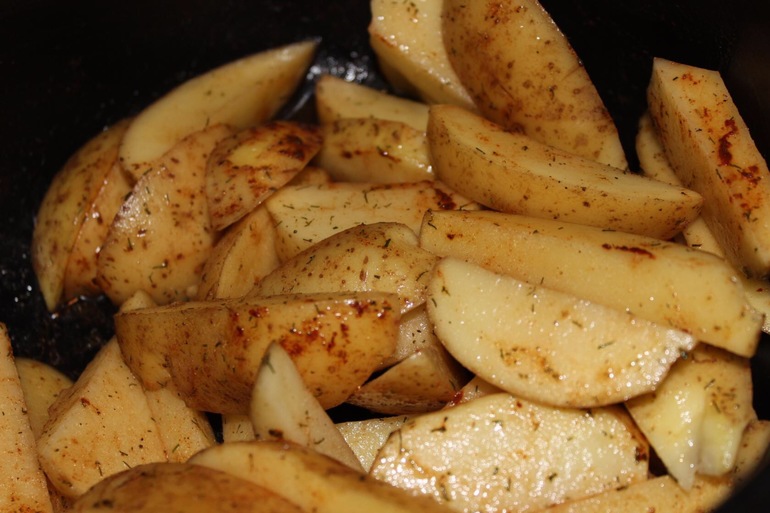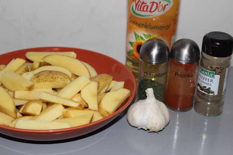 Нам нужен хорошо помытый не чищеный картофель, любая переправа на ваш вкус (у меня паприка, сухой укроп, чёрный перец), 1-2 зубчика чеснока, 2 ст л подсолнечного масла, соль по вкусу.