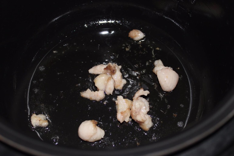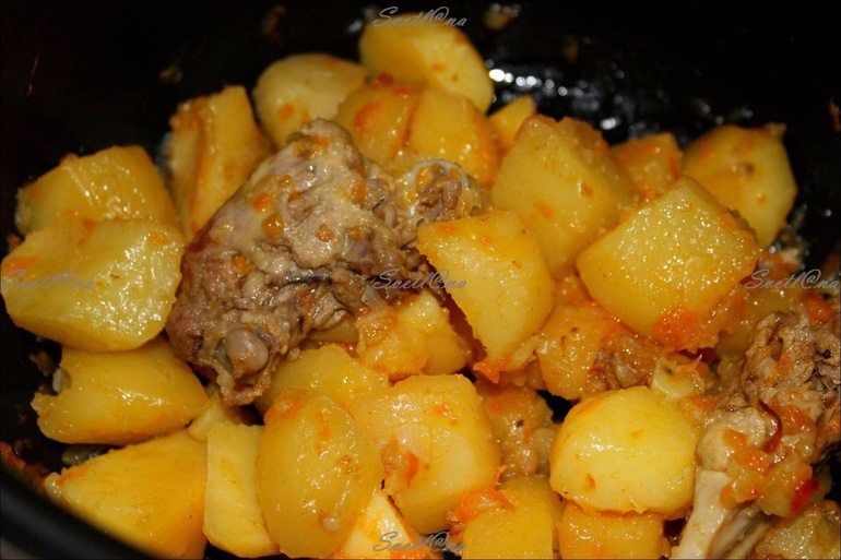 Затем убираем его, если жарим ляжки целиком, то сначала обжариваем их. Затем добавляем лук и морковь и через 5 минут картофель (режим крупно), солим, перчим, добавляем приправу (можно без неё), воды я не добавляю, но если видите, что нет совсем жидкости, то хватит пару столовых ложек