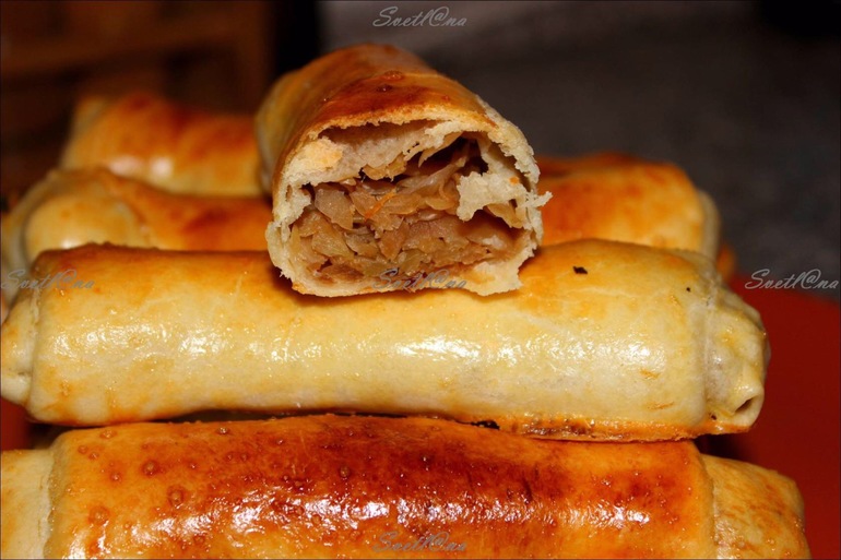 Начинка может быть любой, если добавить корицу-сахар-яблоки, получатся мини штрудели, у меня в этот раз тушёная капуста.