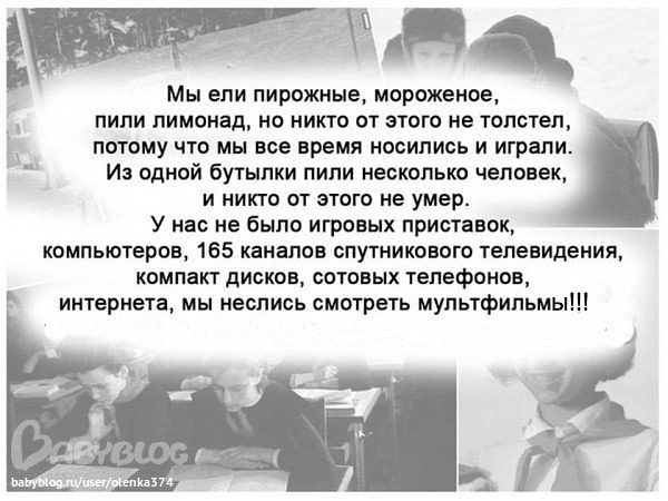 Оля-массажистка(Сходня) 13 лет Ностальгия...... Посмотрите еще 20 записей на эту тему Отменить Ответить Я Самое клевое! Псот отличный! 06.11.2012 Ответить Наталья и правда-ностальжи.........))))))))))) 05.11.2012 Ответить Елена ХОЧУ ТУДА!!! 05.11.2012 Ответить olika прям всё в точкугрустно,что наши дети этого лишены... 04.11.2012 Ответить ---- Фото... Чаты Беременных Выберите чат: Январята-2026 Февралята-2026 Мартята-2026 Апрелята-2026 Майчата-2026 Июнята-2026 Июлята-2026 Августята-2026