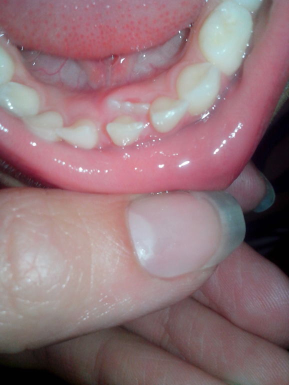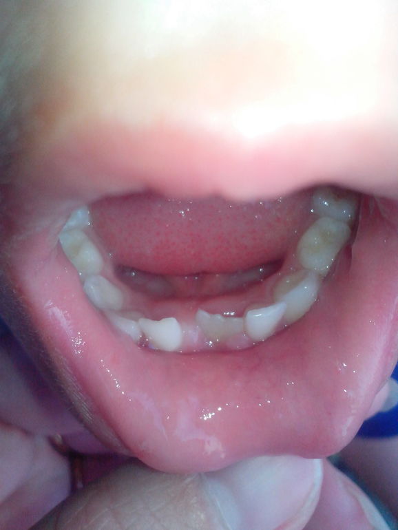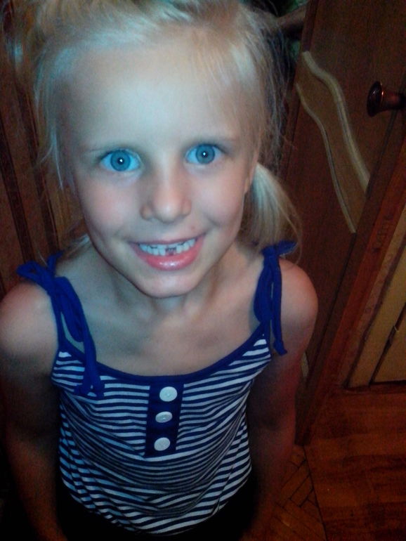 Итак, 17 июля в 5 лит и 11,5 мес у Стасёны появился 21 зуб как-то не на месте (первый молочный зуб появился ровно 5 лет назад в 11,5 месяцев, вот такое совпадение). Я тогда ужасно перепугалась, так как такого вообще не ожидала. С самого рождения тщательно следим за формированием прикуса и здоровьем зубов. Выглядело это страшное зрелище вот так: