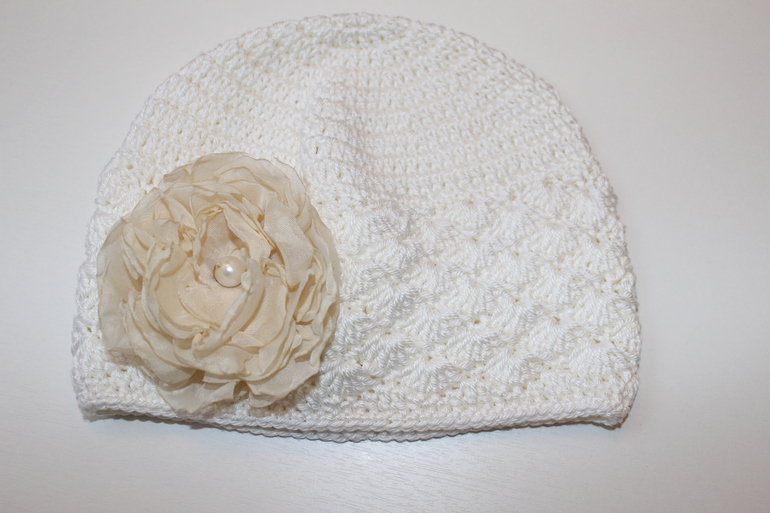 Готовая шапочка крючком из хлопка с шифоновым цветком