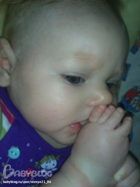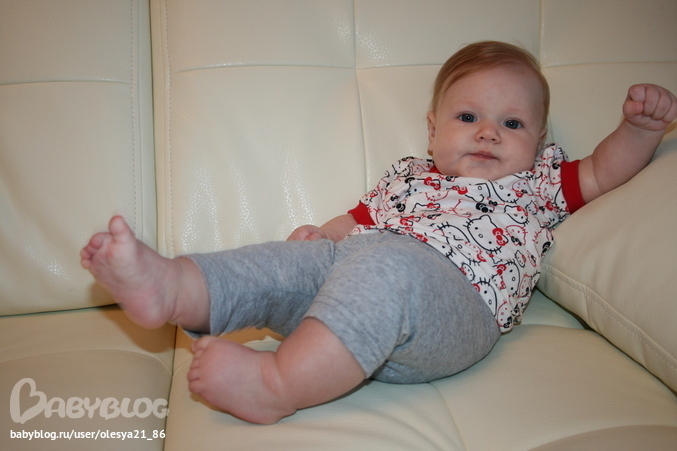О козюле... Совсем большая стала моя девочка! Растет!!! Весим 7кг, рост 65. Очень любим играть и целоваться! Санечка уже ползает назад, вперед пока что учится. Встает на четвереньки, раскачивается. Иногда прыгает как лягуха вперед)) Смешная такая! Разговаривает на своем языке с интонациями. То спрашивает что то, то восклицает! Любит дурачиться, когда я ее на руках держу, качаю, кусаю, открывает рот от удовольствия и визжит! Целует меня в ответ. Облизывает мне то щеки то подбородок, иногда нос)))) Спим вместе, сил вставать по ночам нет. Сначала не очень удобно было, сейчас уже уснуть не могу без Сашеньки) Кушаем сисю в основном. Из овощей ввела уже кабачек, цветную капусту, картоху. Из фруктов - яблочко, персик, кашку фруто няня гречневую молочную (подмешиваю туда пюре фруктовое, без него не любит), любим пить сок яблочный, грушевый!