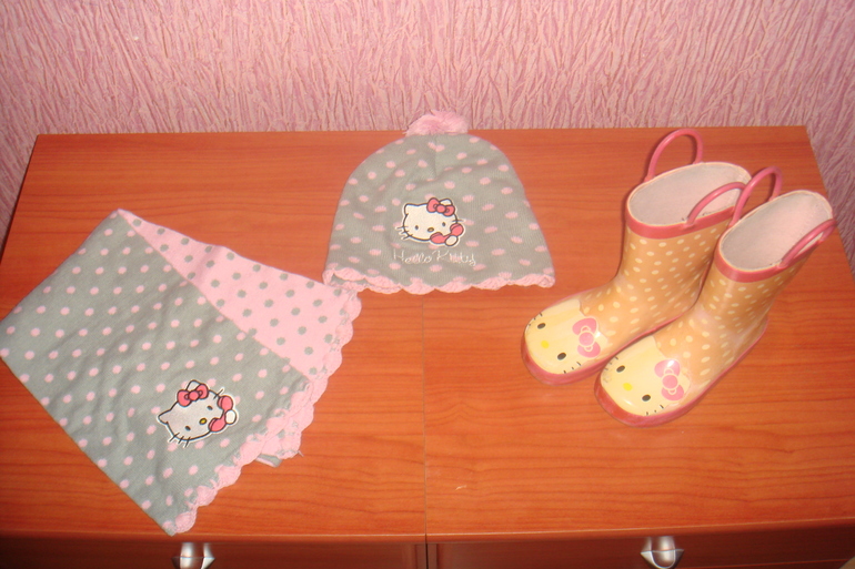 шапочка (двойная) и шарф с Китти 48-52, 300 рублей, к нему отдам сапожки с Китти, цвет выгорел.