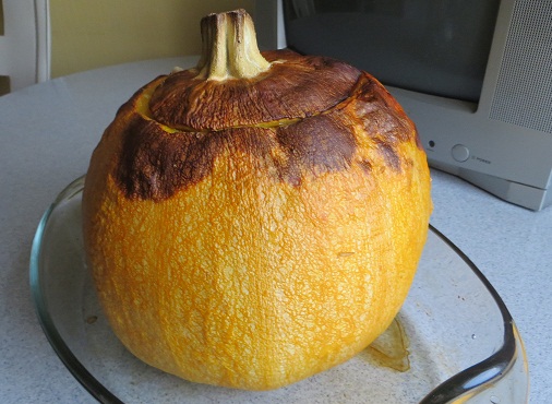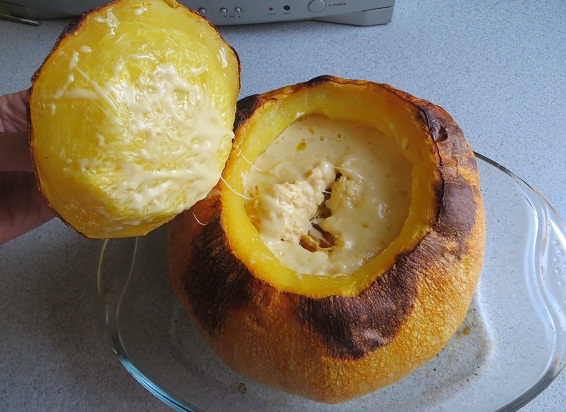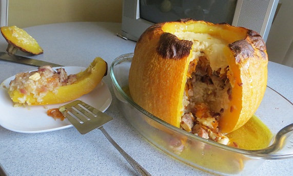 Обжариваем нарезанные небольшими кусочками грудки (солим, перчим) отвариваем до полуготовности промытый ,присоленый рис,жарим мелко нарезанный лук, отдельно тертую морковку.Тыкву моем, отрезаем "шляпку", вынимаем внутренности. Закладываем слоями рис, грудки,лук, курагу,морковку сверху соус, закрываем и ставим на 2 часа в духовку на 180.Достали, под крышку посыпали тертым сыром и еще 3 мин....Кушкаем!!!