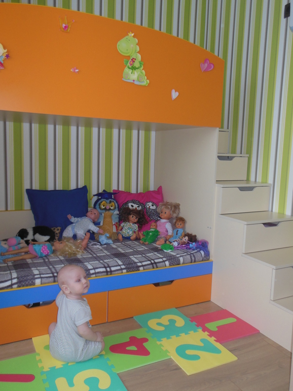 сегодня пока я значит наводила порядки на кухне, егора оставила в детской играть на полу, мужа дома не было, доча со мной на кухне , кушает сидит, я значит завертелась, закрутилась все же нужно быстрей- быстрей успеть, периодически бегаю смотрю где малыш, в очередной раз забегаю в детскую его нет, в нашу комнату, ванну , туалет, коридор-нет ни где, я в шоке, думаю нужно еще раз обойти все комнаты, опять захожу в детскую, заглядываю за дверь, (а за ней у нас сразу начинается ступеньки на второй этаж кровати), так вот, заглядываю и вижу как вы думаете что???? а то что мой ребенок уже на 3 ступеньке и карабкается на 4, я как схватила его, капец а если бы он шлепнулся...страшно представить, слава богу все обошлось, дак меня больше мучает другой вопрос, КАК, КАК в 6 месяцев можно залезть на ступеньки, что за дети акселераты пошли.....!!!!!!!!!!!!!!