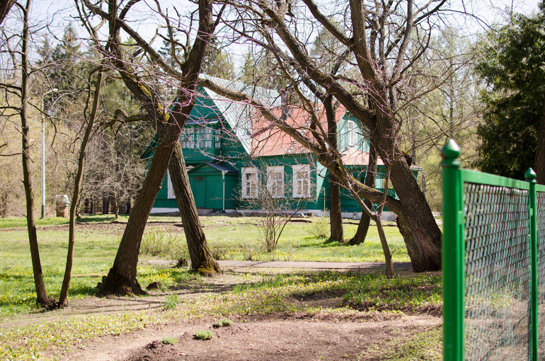 От моста влево зашли в ворота питомника. Справа находится зеленый дом, который раньше принадлежал любимому ученику Мичурина - Яковлеву. Он построил дом, чтобы быть рядом и продолжать дело учителя. После его смерти там жили какие то люди. В настоящее время дом пустует, но планируют открыть "Музей достижений мичуринской науки".
