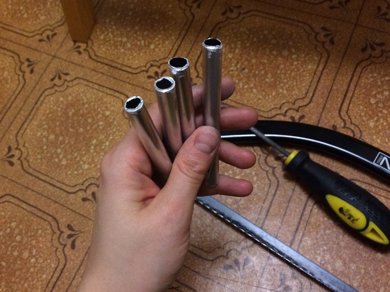 Пилить тяжко, но я справилась. Вспомнила "Книгу для сыновей и для пап", которая у меня была в детстве. Хоть я и не сын и тем более не папа, запомнила, что трубки пилят не сплошняком, а поворачивая. Так и пилила, а потом отламывала кончики.