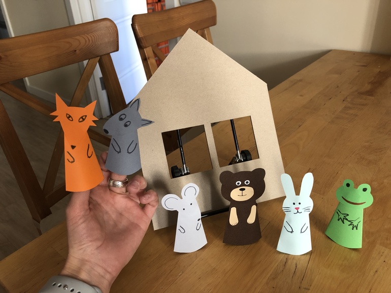 На первой неделе одно из мероприятий - игра-театр по сюжету "Теремка". Я сделала минималистичный домик и зверюшек, которые надеваются на пальцы: