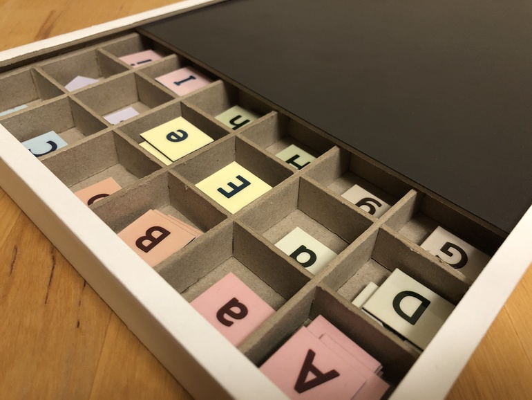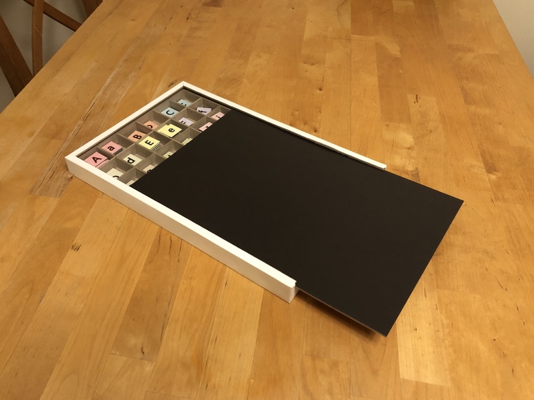 Все буквы на виду, заглавные рядом со строчными. Крышка - магнитная доска.